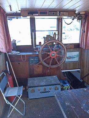 Entry is via the large wheelhouse, home to the vessel’s traditional navigational controls. This bright space offers panoramic views and works well as either a dining area or second lounge.